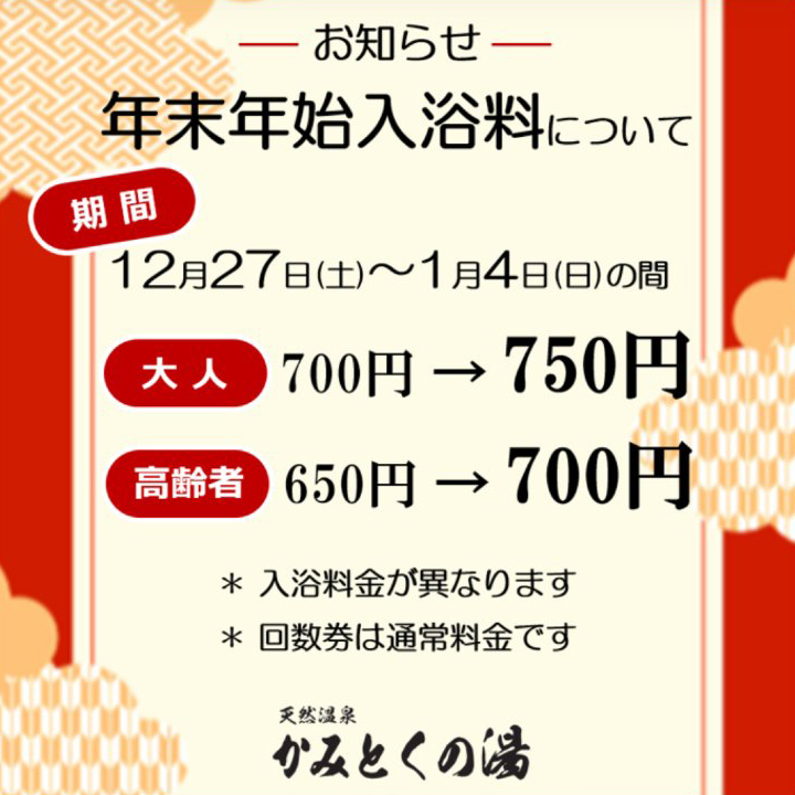 年末年始の特別入浴料金 年末年始の営業時間 2025年12月30日(火)まで平常営業 2025年12月31日(水)大晦日 早朝6時〜夕方18時(札止め 17時) 2026年1月1日(木・祝)元旦 お昼12時〜深夜24時(札止め 23時) 2026年1月2日(金)から平常営業 早朝6時〜深夜24時(札止め 23時) ※家族風呂は、閉店時間が異なります。