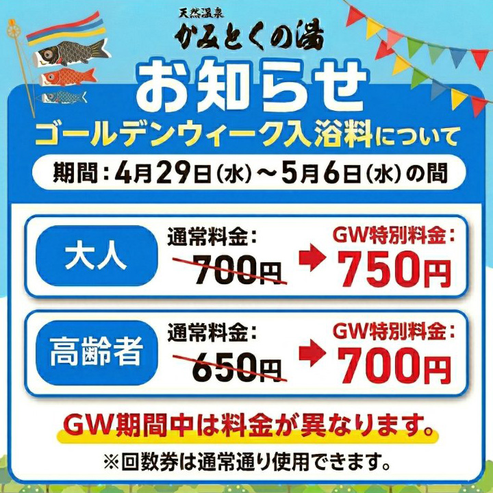 4月29日(水)〜5月6日(水)の期間は繁忙期のため、特別入浴料金となっております。 ※回数券は追加料金なしでそのまま使えます。 連休はぜひ、当店の広いお風呂でリフレッシュしてくださいね♪ 皆さまのお越しをお待ちしております。